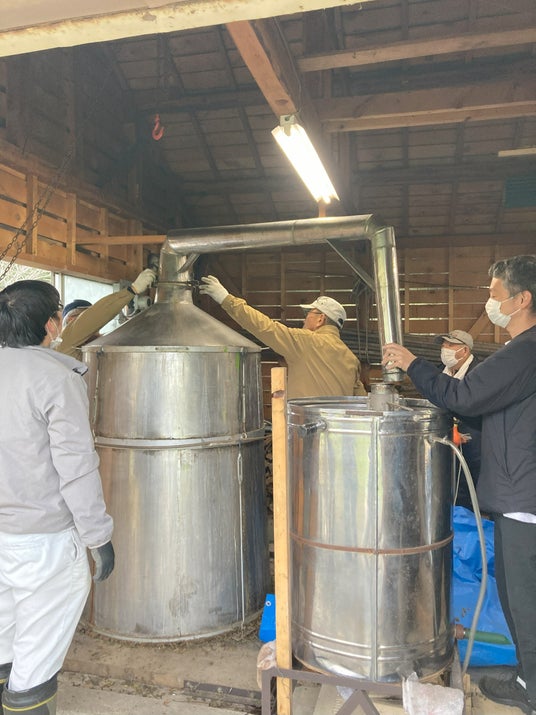 「懐かしいあの香りをもう一度嗅ぎたい。子供たちに薄荷を伝えて欲しい!」という一心で、当時ボランティア栽培を続けていた三井正憲氏と出会うことができた町の教育委員会職員らは、三井氏から貴重な薄荷の苗を譲り受け、栽培方法や蒸留技術を継承し、中川町エコミュージアムセンター(廃校を活用した自然誌博物館)の敷地へ薄荷畑をつくりました。平成20年の蒸留所建設では、地域住民と協力して昔ながらの方式で竃をつくり、三井氏が昭和40年代まで使用していた薪の蒸留機を設置しました。