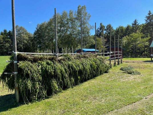蒸留しやすいよう2週間ほど稲架掛けで乾燥させる