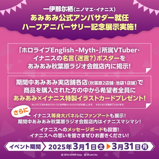1.「あみあみ」の公式アンバサダーに、VTuberグループ「ホロライブEnglish」所属VTuber「一伊那尓栖(Ninomae Ina'nis)」が就任し、ハーフアニバーサリーを迎えたイベントを2025年3月1日(土)~3月31日(月)の期間で開催いたします。