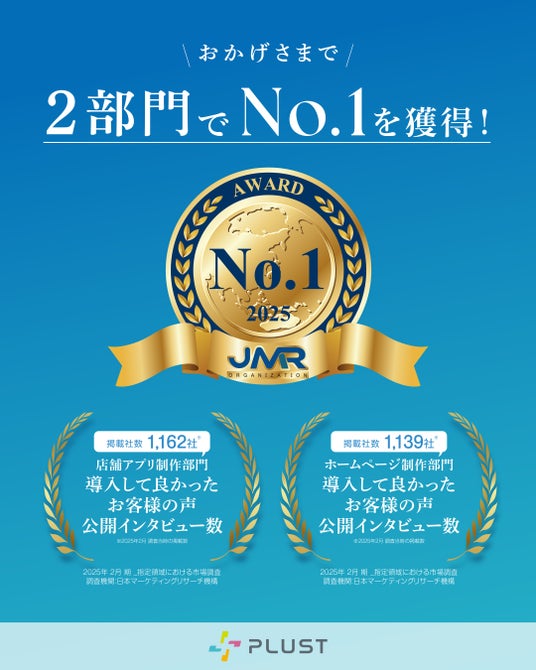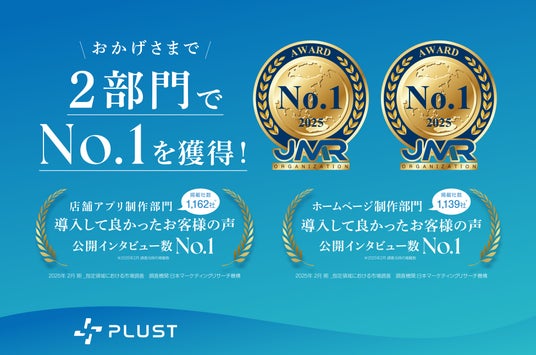 『導入して良かったお客様の声公開インタビュー』の自社ホームページ上公開社数が2,300社を突破した株式会社プラスト (本社:埼玉県さいたま市中央区新都心、 代表取締役:山下 友由)は、"情報の力で、 明日の日本の未来を創造する” を理念に、国内で5,500件以上のマ ーケットリサーチを行っている日本マーケティングリサーチ機構(JMRO)が2025年2月に実施した指定領域における市場調査において、『店舗アプリ制作部門 導入して良かったお客様の声公開インタビュー数』、『ホームページ制作部門 導入して良かったお客様の声公開インタビュー数』の2部門でNO.1を獲得いたしました。