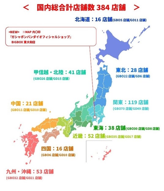 『ガシャポンバンダイオフィシャルショップ』BIGBOX東大和店は、240面を一堂に展開するバンダイ公式のカプセルトイ専門店として、東京都東大和市に出店します。バンダイの新商品をすべて取りそろえ、ここでしか味わえない「ガシャポン体験」を提供することで、「ガシャポン」の新たな魅力を発信していきます。