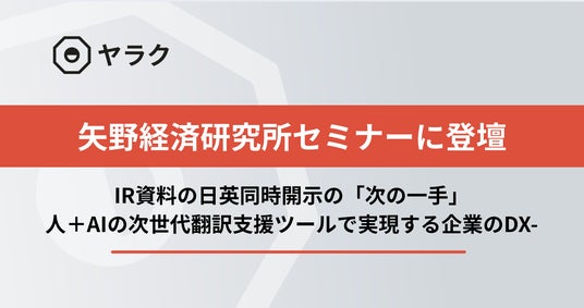 生成AIを搭載した翻訳支援ツール(CATツール*)「ヤラク翻訳」を提供する八楽株式会社(本社:東京都渋谷区、代表取締役社長:坂西優)は、2025年6月25日(水)に開催される株式会社矢野経済研究所(本社:東京都中野区、代表取締役社長:水越孝)主催の「WHATSセミナー」において、代表の坂西が登壇することをお知らせいたします。