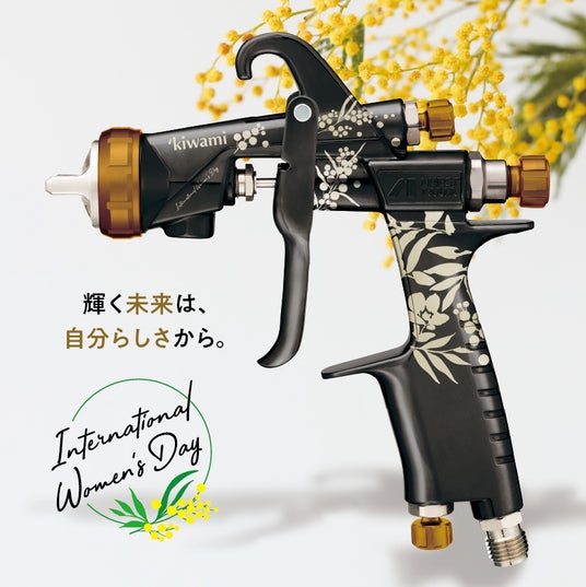 塗装業界における人手不足が問題視される中で、国際女性デーをきっかけに「塗装業界が、さらに様々な人が活躍できる業界になってほしい」という想いから、ミモザの花をあしらった記念モデルのスプレーガンをデザインしました。この特別な記念スプレーガンを通して、「輝く未来は、自分らしさから。」をモットーに自分らしい輝きを持つすべての人々を応援いたします。