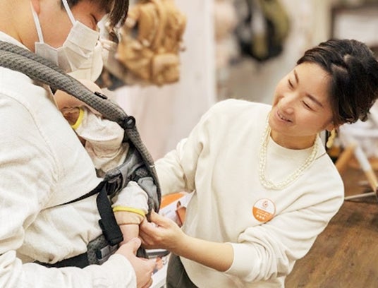 「エルゴベビーアドバイザー」とは、日本正規総代理店である株式会社ダッドウェイの社内試験に合格したスタッフのこと。「特定非営利活動法人だっことおんぶの研究所」等、外部の専門家からも知識を習得し、店頭でのご案内やお悩み相談会を行うエルゴベビーのスペシャリストです。会期中は、抱っこの基本となる素手での抱き方やコツをお伝えしながら、アドバイザーが丁寧に試着をサポートいたします。