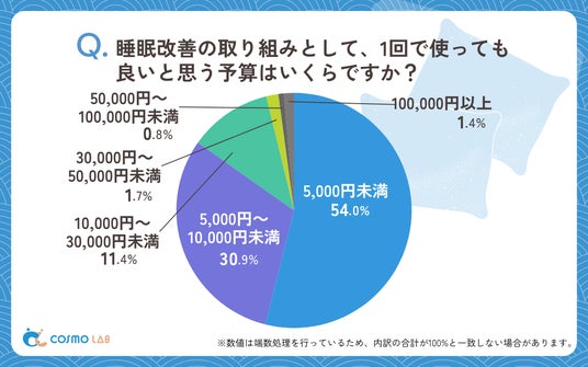 改善策としては「規則正しい生活」(47.6%)や「湯船に浸かる」(40.4%)といった基本的な習慣を重視する傾向が見られ、物理的な対策としては「枕」(46.4%)や「敷布団・マットレス」(33.0%)といった寝具への投資が中心となっています。予算感としては「5,000円未満」(54.0%)が過半数を占め、手頃な価格での実践的な対策が望まれています。