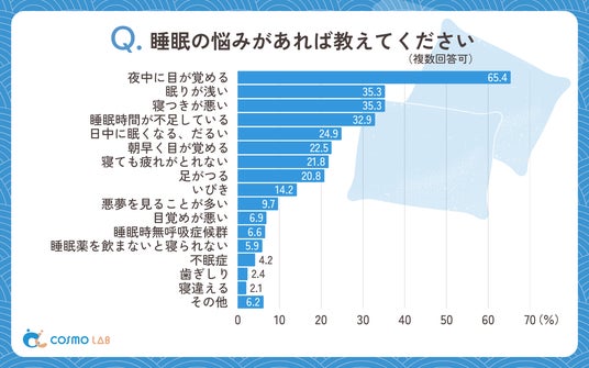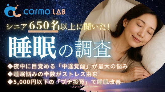 シニア専門のマーケティングプラットホーム コスモラボ(会社名:コスモヘルス株式会社、本社:東京都港区、代表取締役社長 小塚 崇史)がシニア層の『睡眠』に関するアンケートリサーチのレポートをリリースしました。本レポートでは、睡眠時間や就寝・起床パターン、睡眠の質、悩みの原因、改善策など、多角的な視点からシニア世代の睡眠の実態と課題が明らかになりました。