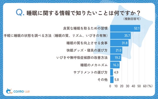 睡眠に関する情報ニーズとして「良質な睡眠を取るための習慣」(52.1%)が最も高く、「手軽に睡眠の状態を調べる方法(睡眠の質、リズム、いびきの有無)」(35.7%)、「睡眠の質を向上させる食事」(31.8%)、「快眠グッズ・寝具の選び方」(21.0%)が続いています。日常生活に取り入れやすい習慣や方法への関心が特に高く、実践的かつ具体的な情報が求められていることが分かります。そして、自身の睡眠の質を客観的に評価したいというニーズが窺えます。