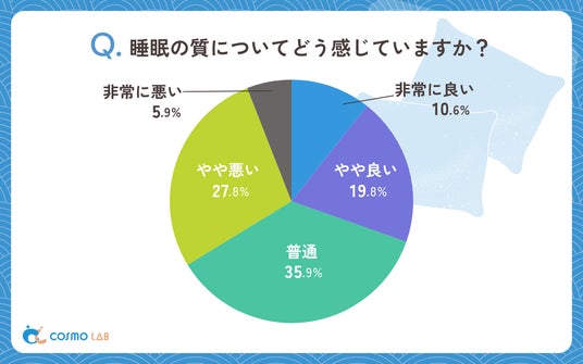 睡眠の質に関しては「普通」(35.9%)が最も多く、「やや悪い」(27.8%)と「やや良い」(19.8%)が続きます。「非常に良い」(10.6%)と「非常に悪い」(5.9%)は少数派となっています。この結果からは、「やや悪い」と「非常に悪い」を合わせると33.7%、つまり3人に1人が何らかの不満を感じていることが分かります。