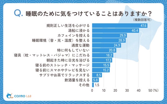 睡眠改善のための取り組みとして「規則正しい生活を心がける」(47.6%)が最も多く、「湯船に浸かる」(40.4%)、「カフェインを控える」(29.9%)、「睡眠環境(音・光・温度)を整える」(28.9%)、「適度な運動」(24.9%)が続いています。基本的な生活習慣の改善と入浴による身体のリラックスが主な対策として実践されていることが分かります。特に、規則正しい生活リズムへの意識が高く、睡眠の質向上には生活全体の安定が重要であるという認識が窺えます。