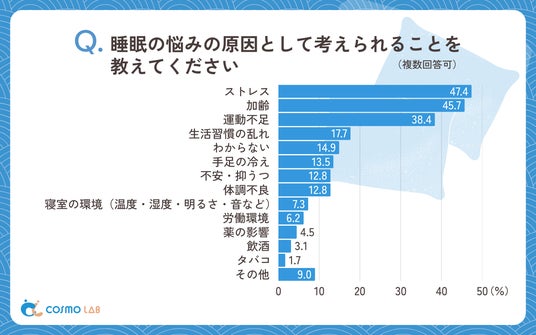 睡眠の悩みの原因として「ストレス」が47.4%と最も高く、心の状態が眠りに大きく影響していることが分かります。「運動不足」(38.4%)と合わせると、現代生活のアンバランスさが睡眠障害を引き起こす主因となっています。