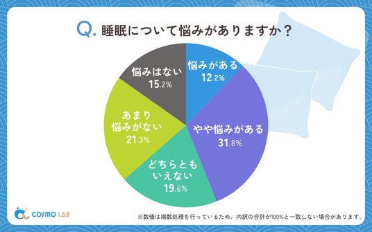睡眠への悩みについては「やや悩みがある」(31.8%)が最多で、「あまり悩みがない」(21.3%)、「どちらともいえない」(19.6%)が続きます。注目すべきは、「やや悩みがある」と「悩みがある」を合わせると44.0%と半数近くに達する点です。この結果は睡眠の質に対する評価と整合性があり、質に不満を感じている層が具体的な悩みも抱えていることが窺えます。