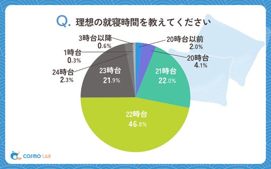 理想とする就寝時間は「22時台」(46.8%)が圧倒的に多く、「21時台」(22.0%)、「23時台」(21.9%)が続いています。実際の就寝時間と比較すると、「22時台」を理想とする割合(46.8%)は実際に22時台に就寝している割合(27.8%)を大きく上回っており、より早い時間に就寝したいという願望が強いことが窺えます。