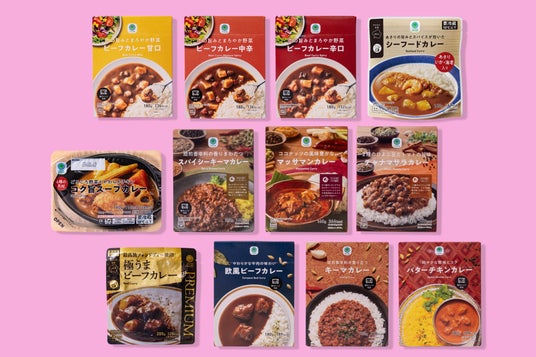 (肉の旨みとまろやか野菜 ビーフカレー甘口、肉の旨みとまろやか野菜ビーフカレー中辛、肉の旨みとまろやか野菜 ビーフカレー辛口、あさりの旨みとスパイスが効いたシーフードカレー、ごろごろ野菜とやわらかチキンコク旨スープカレー、焙煎香辛料の香りきわだつ スパイシーキーマカレー、ココナッツの風味豊かな マッサマンカレー、2種のひよこ豆とトマトの旨味 チャナマサラカレー、最高級フォンドヴォー使用 極うまビーフカレー、やわらかな牛肉の味わい欧風ビーフカレー、焙煎香辛料の香り立つ キーマカレー、爽やかな酸味とコク バターチキンカレー)