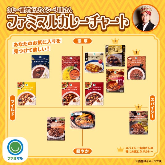 カレー研究家スパイシー丸山さんにご協力いただき、12商品を「濃厚」「軽やか」「スパイシー」「マ イルド」の4軸でマッピングした「ファミマルカレーチャート」が完成しました。味の特徴がひと目でわかるチャートを参考に、ぜひあなたのお気に入りのファミマルカレーを見つけてください。