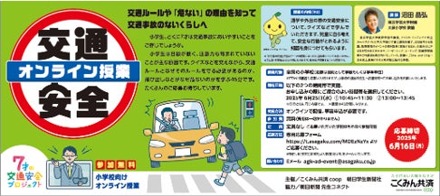 こくみん共済 coop〈全労済〉(全国労働者共済生活協同組合連合会 代表理事 理事長:打越 秋一)は、株式会社朝日学生新聞社(代表取締役社長:安田 雅信)とともに、未来ある子どもたちを交通事故から守る「7才の交通安全プロジェクト」の取り組みの一環として、小学生1年から4年生を主な対象とした小学校向けの「交通安全オンライン授業」を6月25日(水)に実施します。交通安全についてクイズなどを交えて、小学生が自ら考え安全な行動をとれるように知識を身につけてもらう内容です。