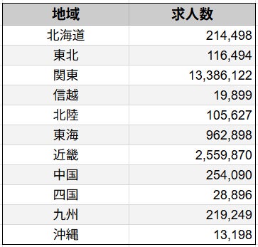 全国を11の地域に分類して集計した結果、最も求人数が多かったのは「関東」で、1,338万件超という圧倒的な件数を記録。次いで「近畿」(約255万件)、「東海」(約96万件)と、都市圏に求人が集中している傾向が明らかになりました。