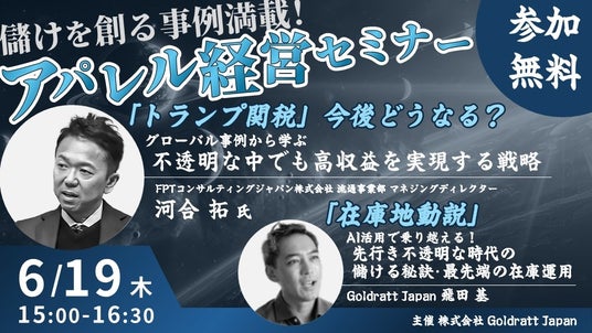 Goldratt Japanは、2025年6月19日、無料セミナー「儲けを創る事例満載!アパレル経営セミナー」を開催します。ゲスト講師に企業再生コンサルタントの河合拓氏をお招きし、オンラインにて講演を無料配信します。