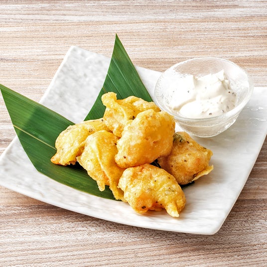 サーモンフリット レモンクリーム 899円(税込988円)とっとり琴浦グランサーモンをフレッシュタイムでマリネしてふんわりフリットにしました。
