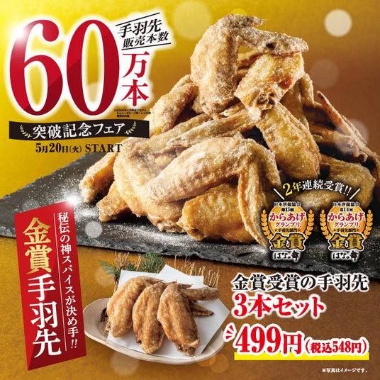 【チムニー株式会社】からあげグランプリ金賞受賞 「手羽先唐揚げ 販売累計60万本突破記念フェア」開催。