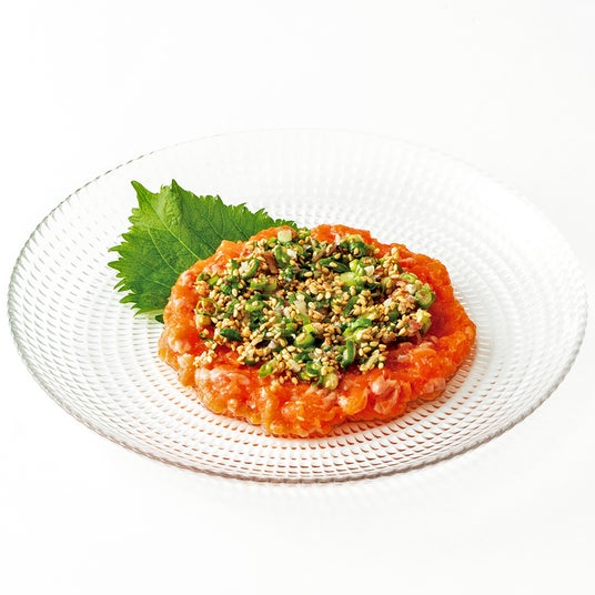 薬味のせ タルタルサーモン 899円(税込988円)とっとり琴浦グランサーモンに薬味を使った新感覚のなめろう風タルタルに仕上げました。