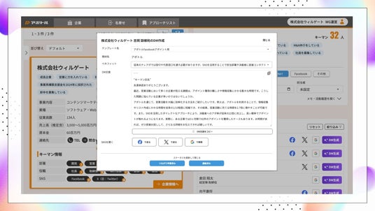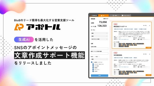 株式会社ウィルゲート(本社:東京都港区、代表取締役:小島 梨揮、以下「ウィルゲート」)が提供する企業データベース「アポトル」は、このたび生成AIを活用したSNSアポイントメッセージの文章作成サポート機能を新たにリリースしました。