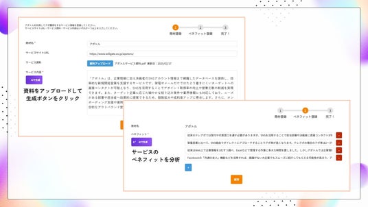 サービス資料をアップロードするだけで、AIが事業内容を自動で要約し、メッセージに盛り込みやすいポイントを提案します。