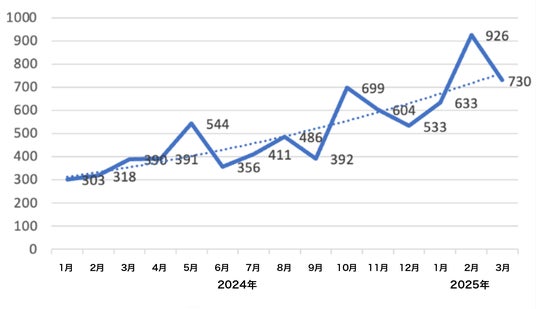 図1 - DLS(データリークサイト)で月別に公開されたランサムウェア被害件数の推移