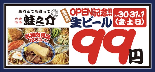 オープンの5月30日(金)・31日(土)・6月1日(日)は生ビール99円!