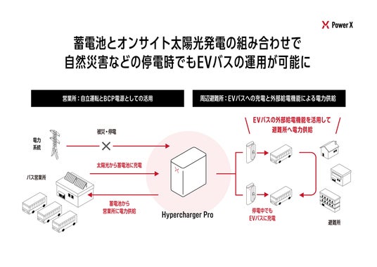 一方、パワーエックスは、今後運用データとバス事業者からのフィードバックを基に、蓄電池を活用した充電システムを、さらなるEVバスの導入にも対応可能な次世代のエネルギーマネジメントソリューションとして開発を進めます。さらに災害への備えとして、「Hypercharger Pro」の蓄電システムを自立運転可能とし、停電時でも車両充電や営業所のBCP電源として活用できる機能を提供予定です。