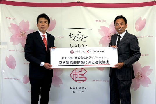 解体工事DXプラットフォーム「クラッソーネ」を運営する株式会社クラッソーネ(愛知県名古屋市、代表取締役CEO:川口 哲平、以下「当社」)は、栃木県さくら市(以下、「さくら市」)と「空き家除却促進に係る連携協定」を締結いたしました。昨今、全国的にも社会課題となっている空き家問題への対策として、さくら市の空き家除却を推進することで、安全安心なまちづくりを目指します。また本締結で、当社の自治体連携の実績は122自治体(行政運営の団体含む)となり、全国での人口カバー率は18%、栃木県内では7.3%となりました(※1)。