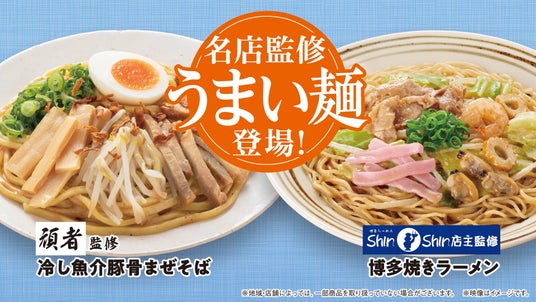 5月20日(火)からは、「頑者」と、「Shin-Shin」監修のうまい麺が登場します。どちらも過去監修いただいた商品が大変人気を博したことから、今年は「頑者」のつけめんたれの濃厚な味わいを再現した「頑者監修 冷し魚介豚骨まぜそば」と、「Shin-Shin」の人気メニューの一つ、「焼きラーメン」を再現した「Shin-Shin店主監修 博多焼きラーメン」を発売いたします。