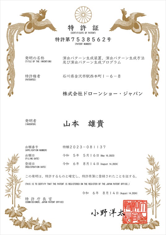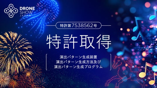 株式会社ドローンショー・ジャパン(本社:石川県金沢市、代表取締役:山本雄貴)は、ドローンによる飛行・発光演出と花火の打ち上げを、音楽と同期させて制御する技術「演出パターン生成装置、演出パターン生成方法及び演出パターン生成プログラム」において、特許第7538562号を取得したことをお知らせいたします。