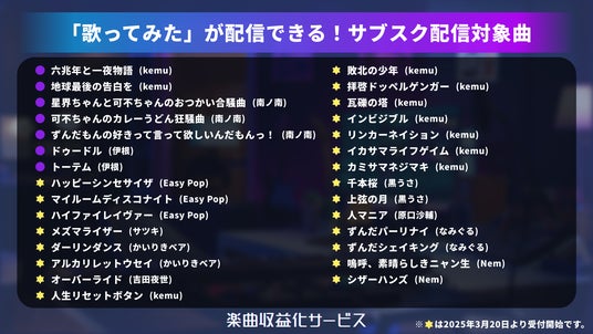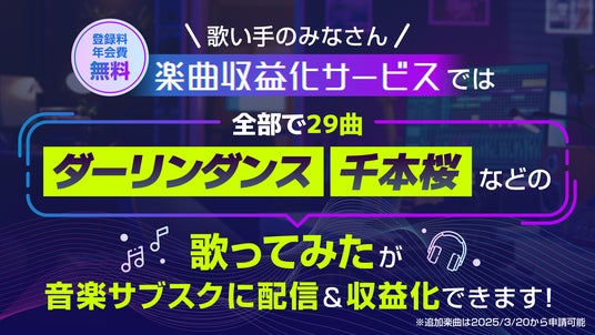 株式会社ドワンゴ(本社:東京都中央区、代表取締役社長:夏野剛)は同社が運営する「楽曲収益化サービス」※にて、2025年3月20日(木)より、二次創作“歌ってみた”のサブスク配信対象曲に、新たに22曲追加(全29曲)することをお知らせします。