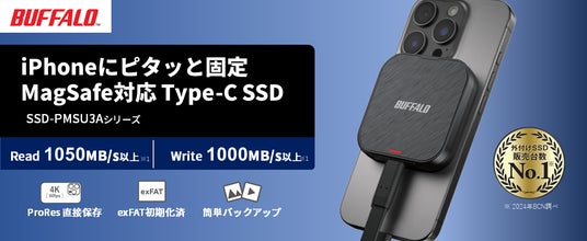 株式会社バッファロー(本社:東京都千代田区、代表取締役 社長執行役員CEO:牧 寛之)は、MagSafe対応でiPhoneに磁力で固定しながら、4K ProRes映像を直接保存できるポータブルSSD「SSD-PMSU3Aシリーズ(容量: 2.0TB、1.0TB、500GB)」を2025年6月中旬より順次出荷、販売いたします。