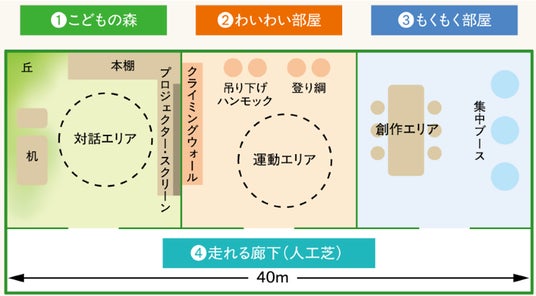 全長40mの廊下と用途の異なる3つの部屋からなる300平方メートル の空間を備え、子どもの五感を刺激して、遊びを楽しみ熱中できる居場所を提供します。JR東戸塚駅から徒歩3分の立地で、天候にとらわれずにのびのびと遊べる環境を提供します。