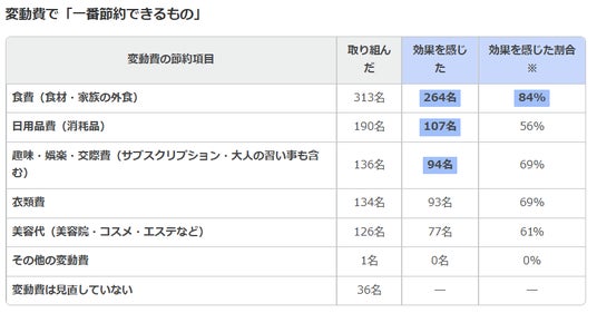 【変動費】一番節約できるもの、節約効果を感じた割合が高いものは「食費」