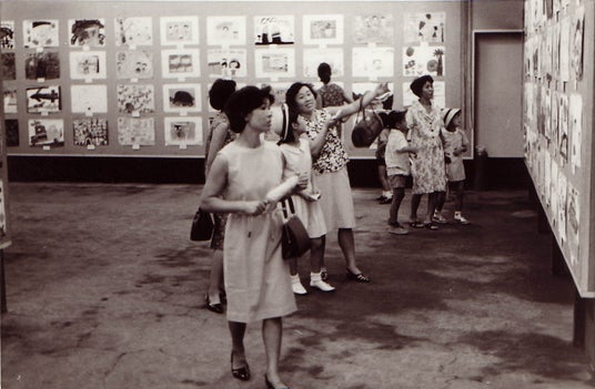 横浜市民ギャラリーが開館した1964年当時の飛鳥田一雄元市長(市長就任期間1963~78年)は、横浜市民ギャラリーが市民であれば誰でも利用できる地域振興の場となることを期待していました。また「子どもを大切にする市政」を方針の一つとして掲げていたことも、子どもを主役とした展覧会の実現につながりました。「横浜市こどもの美術展」の大きな特徴は、アンデパンダン(無審査公募)形式にあります。アンデパンダン形式とは、1965年当時の主流であったコンテスト形式とは異なり、作品に優劣をつけず応募作品を全て展示するものです。子ども一人ひとりの表現を尊重する姿勢は、現在に至るまで継承されています。会場ではこどもの作品展示に加え、時代ごとに様々な取組が行われてきました。