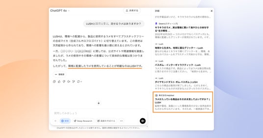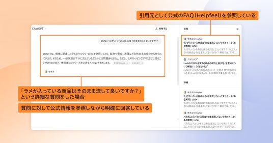 LUSH社(Helpfeel導入済)と他社(未導入)の製品について、ChatGPT上で質問した結果コンテンツの信頼性および情報量の差により、AIによる回答内容に明確な違いが生じるとわかる