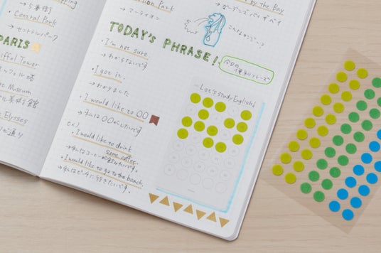 ノートや手帳に貼るだけで、ログページができるシール。ハビットトラッカー、タイムログ、ショートダイアリー、リストの4種類のフォーマット。