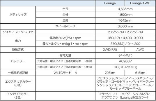 ※ 交流電力量消費率/一充電走行距離は、テュフラインランドが試験を実施し、RDW(オランダの公的機関)が承認した自社測定値です。 一部テスト車両は、日本仕様と細部が異なりますので、数値は参考値となります。交流電力量消費率は定められた試験条件下での値です。 お客様の使用環境(気象、渋滞など)や運転方法(急発進、エアコン使用など)に応じて異なります。 電気自動車は走り方や使い方、使用環境などによって、実際の一充電走行距離が大きく異なります。