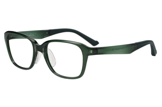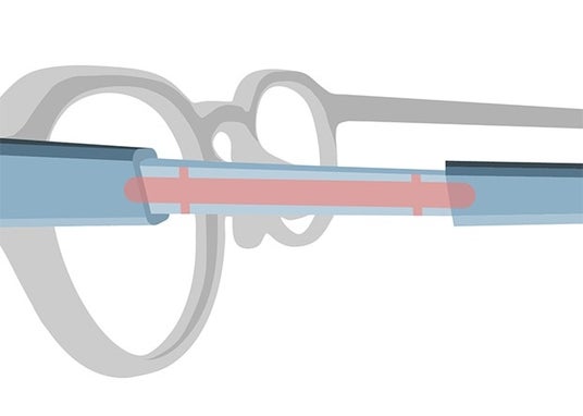 プラスチック製テンプル部分に薄いベータチタンの板を内蔵し、その上をシリコンカバーで覆うことで、スタイリッシュな見た目を維持しつつ、バネ性を持たせて、フレームが反っても元に戻る構造に。また、側頭部への圧力を軽減する工夫も施し、長時間の使用でも快適な着用感を実現しました。