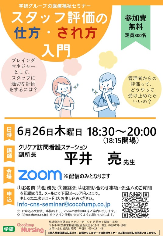 株式会社 学研ホールディングス(東京・品川/代表取締役社長:宮原博昭)のグループ会社で、訪問看護事業を行っている株式会社 学研ココファン・ナーシング(東京・品川/代表取締役社長 :木村 祐介/以下、当社)は、2025年6月26日(木)、無料の医療福祉セミナー「スタッフ評価の仕方・され方入門」を開催いたします。