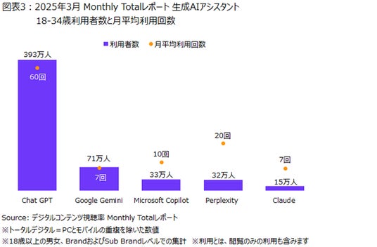 最後に、ターゲットGRP(TARP)が最も高かった18-34歳の利用状況をサービス別に見ると、利用者数は「Chat GPT」が393万人で最も多く、次いで「Google Gemini」が71万人となっていました。また、月平均利用回数でも「Chat GPT」が60回で最も多く、「Perplexity」が20回で続いていました(図表3)。