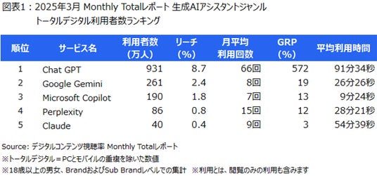 2025年3月のMonthly Totalレポートによると、生成AIアシスタントジャンルにおいて、利用者数が最も多かったのは「Chat GPT」で931万人、「Google Gemini」が261万人、「Microsoft Copilot」が190万人で続いていました。また、平均利用時間では「Chat GPT」が月91分34秒で最も長く、「Claude」が月54分39秒で続いていました(図表1)。