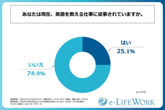 TOEIC(R)800点以上レベルの英語力を持っている30代~50代の男女で、現在、英語を教える仕事に従事している人の割合は約25%