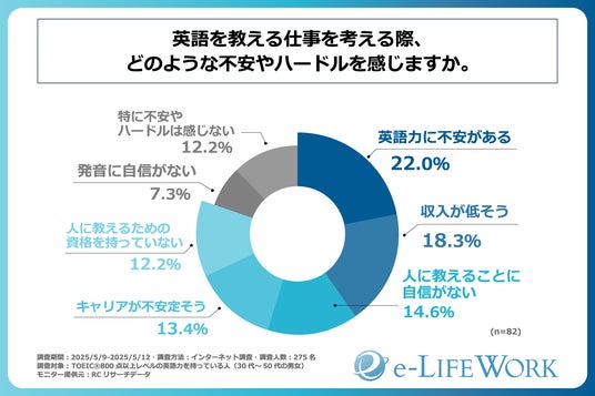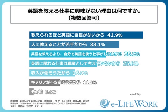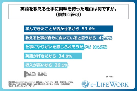 グローバル化が進み、インバウンド需要も高まる中、日本では英語力はますます重要となっている。ただ、その一方で、就職先として学校教師の人気が近年低迷するなど、英語教育に関わる人材不足が課題となっている。そこで、株式会社e-LIFEWORKは、TOEIC(R)800点以上かそれと同等レベルの英語資格をお持ちの30代~50代男女が「英語を教える仕事」をどのように考えているのかを明らかにするため、調査を実施しました。