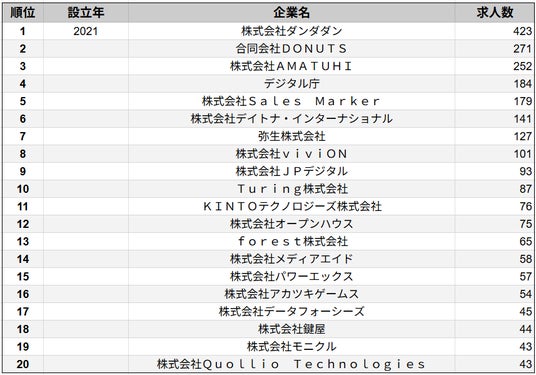 株式会社SalesNow(本社:東京都渋谷区、代表取締役:村岡功規、以下「当社」)は、国内540万社の企業情報を完全網羅した日本最大級のデータベース「SalesNow DB」より、2024年4月1日~2025年4月1日の期間における求人データ(※アルバイト媒体を除く)をもとに、「2021年設立企業」における求人数ランキングTOP20を集計・発表いたしました。