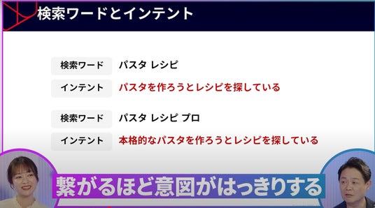 そのような中でも検索データは、個人の「知りたい」「解決したい」という純粋な欲求が反映されやすく、これを「インテントデータ(意図のデータ)」と呼び、消費者の本音に近いものとして非常に重要視されています。例えば、「パスタレシピ」という検索一つにも、「パスタを作ろうとレシピを探している」という明確な意図(インテント)が含まれており、さらに「プロ パスタレシピ」となれば、「本格的なパスタを作りたい」というより具体的な意図が見て取れます。