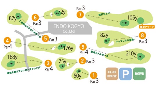 パー4のミドルホールのグリーン近くにティーを設け、パー3にして初心者が一緒でも回り易くする『エンジョイパー3』、NO-7とNO-8ホールの間に、コース利用中アプローチ練習が出来る『アプローチ練習エリア』の増設など、お仕事の合間や余暇の一部を利用して、お一人様でもグループでも1周9ホール、1時間ちょっとで、ウッド、アイアン、アプローチ、パッティングと一通りのゴルフがお楽しみいただけます。ニッチなお楽しみ空間の場をご提供致します。勿論、一日回り放題でとことん打ち込むことも出来ます。