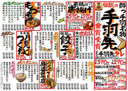 「居酒屋革命 酔っ手羽」は2008年に東京で創業し、昼飲みから深夜、朝まで気取らずにワイワイと料理やお酒を楽しんでいただける大衆酒場として現在は首都圏を中心に24店舗展開しています(京都西院店は第25号店)。「笑って食べて、笑って飲める居酒屋」をモットーに、ユーモラスなポスターやメニューで笑いを誘う一方で、料理とお酒にはこだわりを持ち、質の高い商品をできるだけ安く提供しています。料理のバリエーションは豊富で、肉刺し、揚げ物、餃子や煮込み、サラダ、飯や麺、デザートなど、幅広いジャンルをご用意。中でも「伝説の手羽先」は、お酒との相性を極めた人気の看板メニューであり、手羽先料理コンテストの「第10回手羽先サミット」と「第15回からあげグランプリ手羽先部門」でダブル金賞を受賞した自慢の逸品です。ドリンクもバリエーション豊富に取り揃えています。また、毎日「日替りイベント」を開催しており、ハイボールやレモンサワー半額、飲み放題1時間500円、手羽先や唐揚げ100円など、日替わりの特売企画を毎日実施しています。さらに、毎月18日は「手羽(18)の日」として「伝説の手羽先(3本319円、5本429円)」を1本18円の特別価格でお楽しみいただいています。